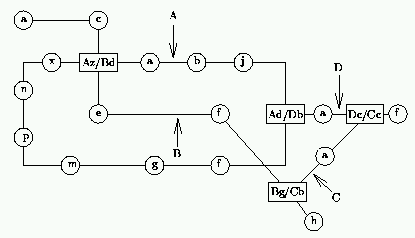 To simplify matters, each route is given a designation letter from the set A to Z, and each station along a route will be designated by another letter from the set a to z. Connecting stations will have more than one designation. Thus an example could be: